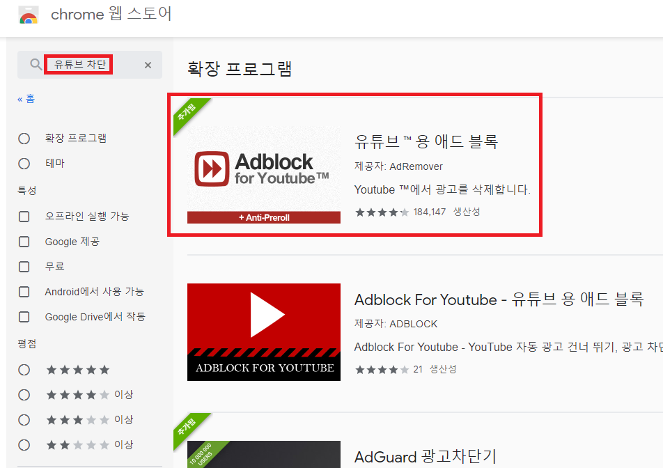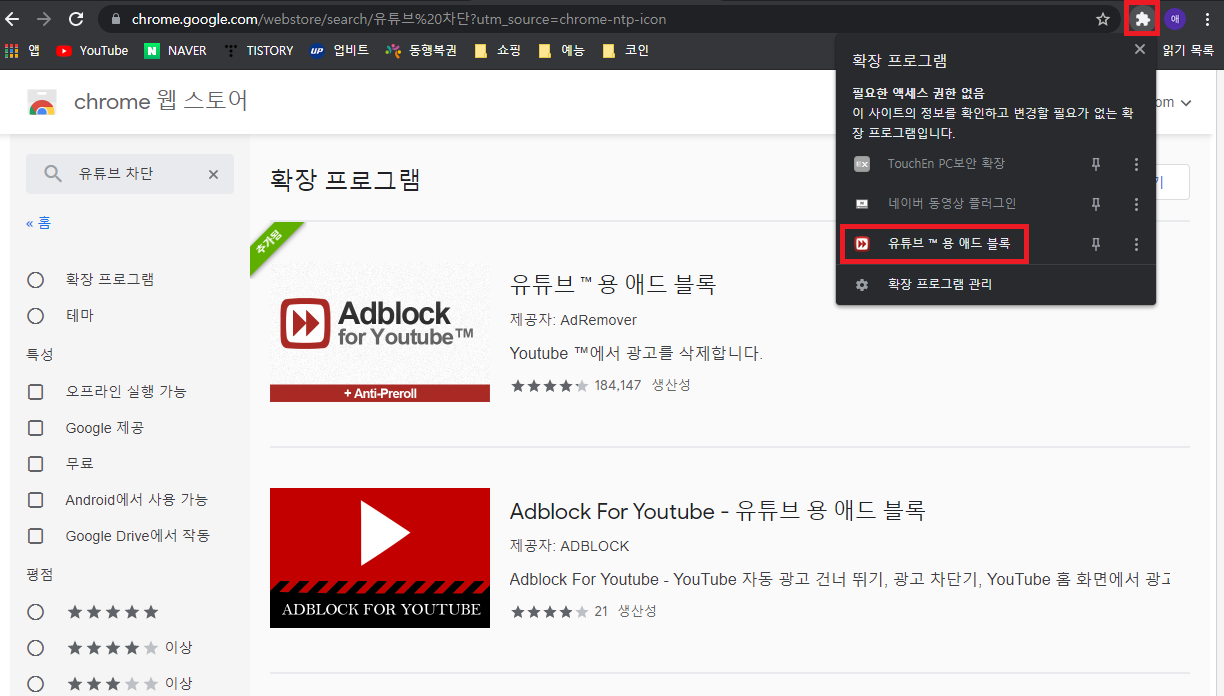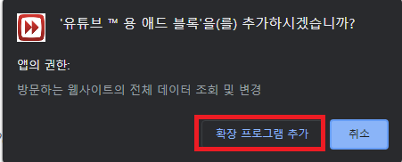 2. 유튜브 차단 검색-> 유튜브용 애드 블록 클릭