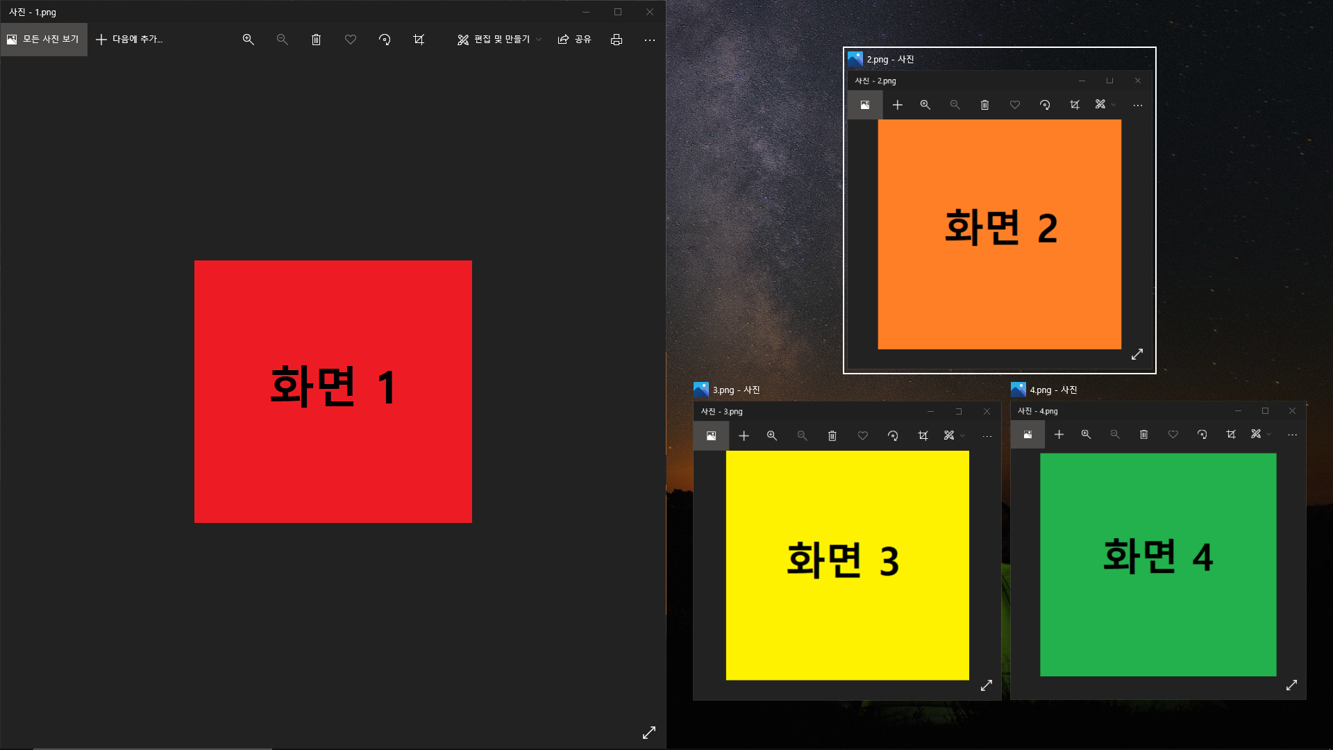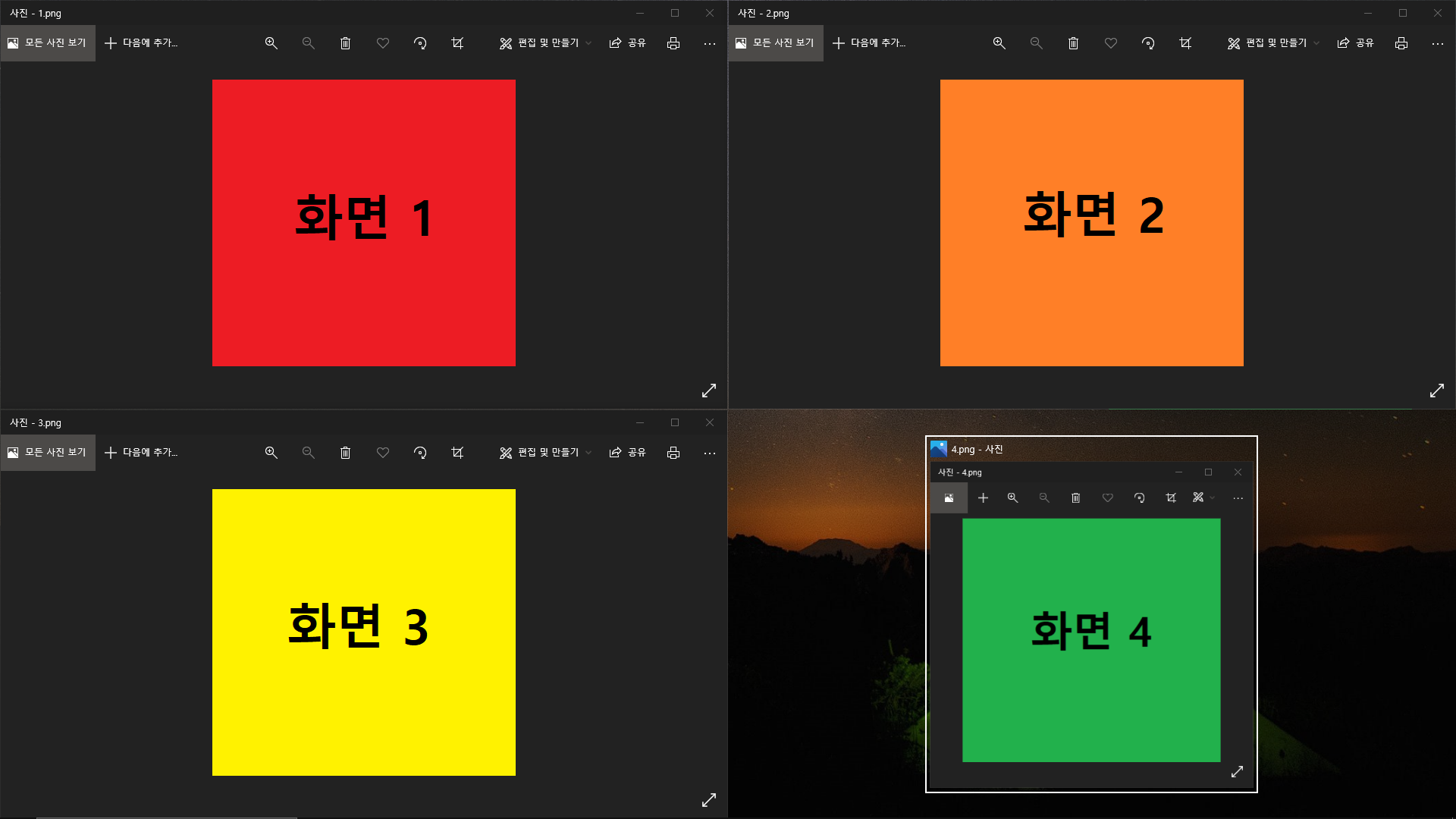 우측 상단으로 화면 2가 이동하고 빈 공간에 나머지 창인 화면 4를 선택하면,