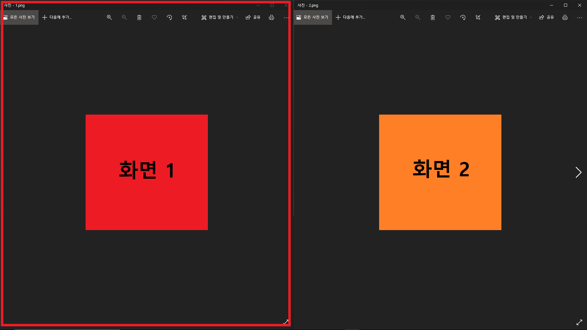 또 똑같은 방법으로 화면 2를 클릭하고 윈도우키 + 윗 방향키를 누르면,