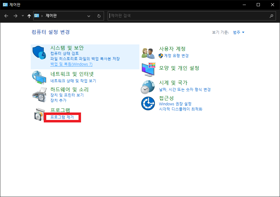 제어판 목록 중에서 왼쪽 하단에 프로그램이 위치해 있을 것이다.