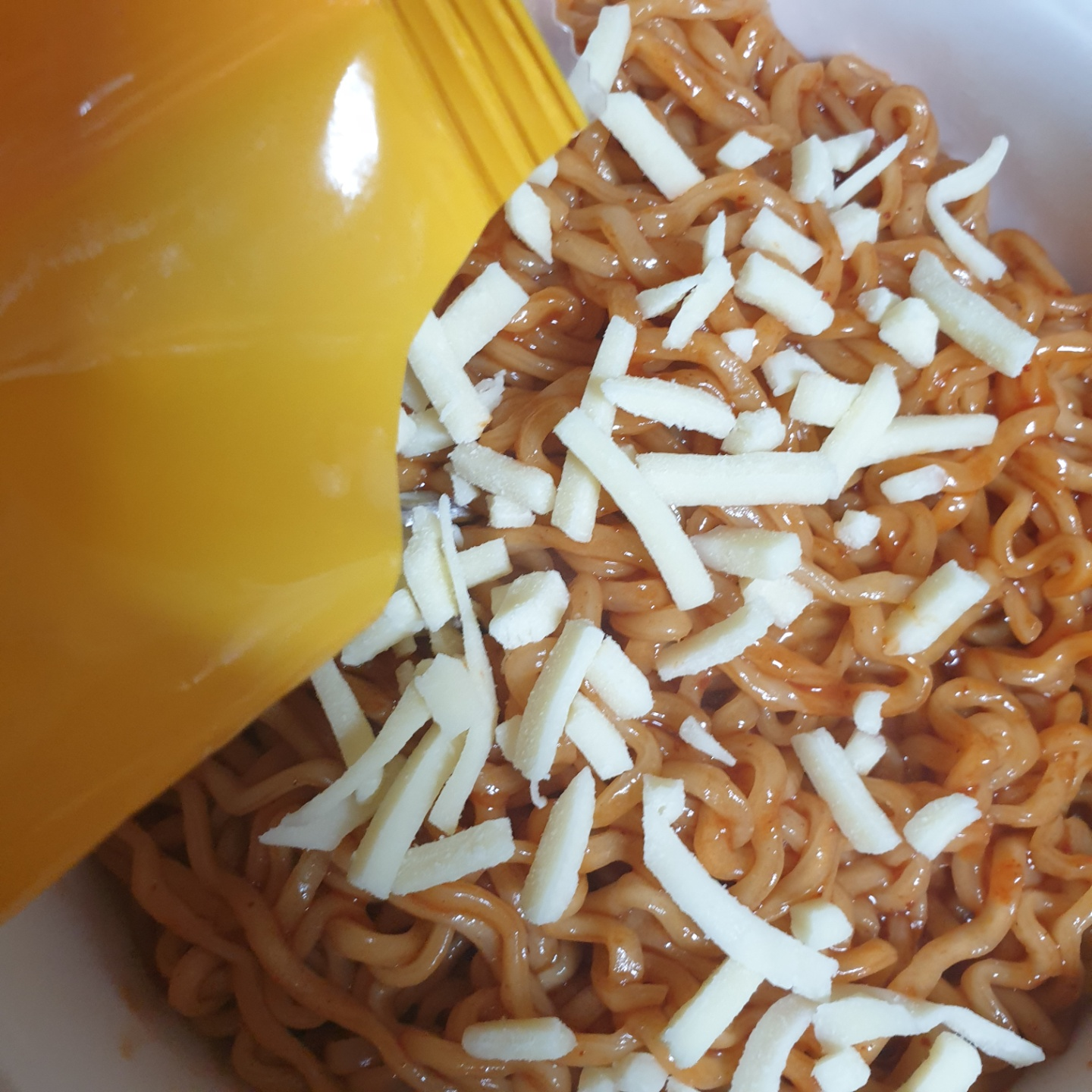 나는 불닭볶음면 위에 모짜렐라치즈를 뿌려먹어 보았다.