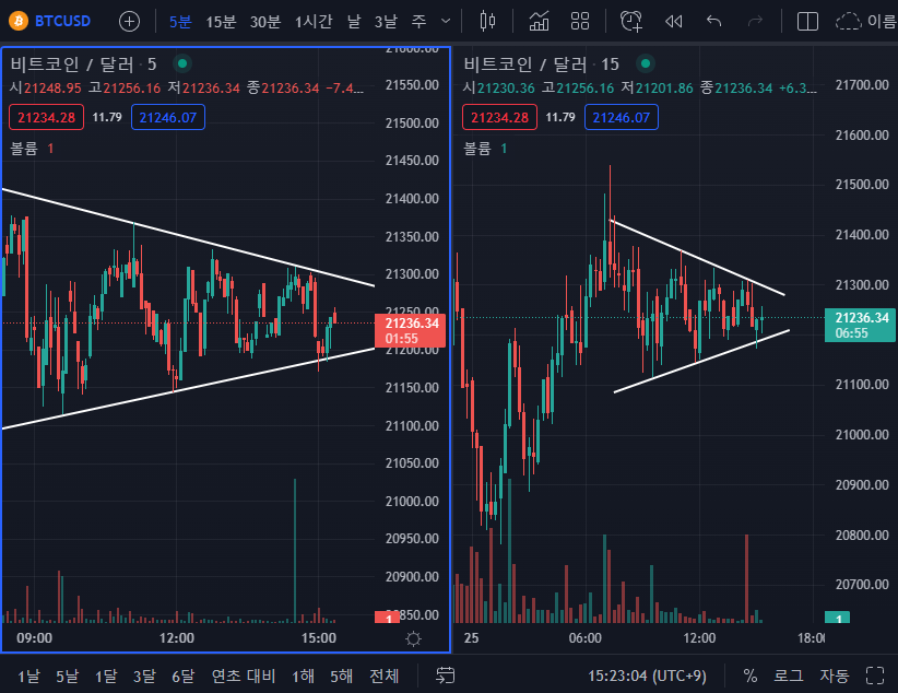 트레이딩뷰로 비트코인 5분봉 15분봉 1시간봉 차트 여러 개를 띄워놓고,
